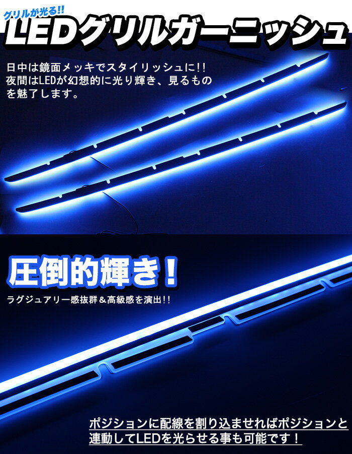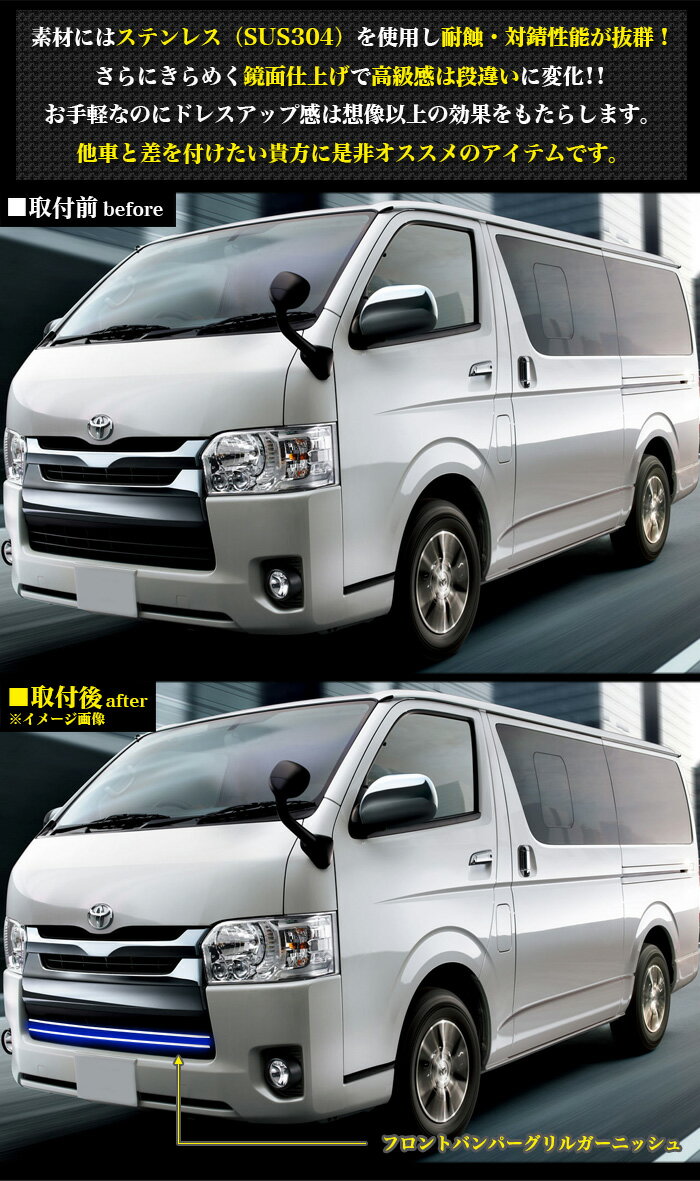 ドレスアップ効果抜群のアイテムです! ■適合:ハイエース/レジアスエース200系 KDH200/TRH200系 標準 4型 ※DX/スーパーGL対応 ■年式:H25.12〜 ■LEDカラー:ブルー ■サビに強いSUS304ステンレス製 ■表面パフ仕上げで煌めき抜群の鏡面仕上げ ■3D立体プレス成型品 ■両面テープ装着済み ■セット内容:フロントバンパーLEDグリルガーニッシュ 2P ※取付・取扱説明書は付属しておりません。