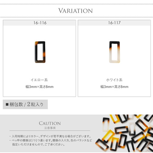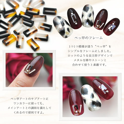 製品情報 梱包数 2粒 サイズ 幅3mm×高さ8mm 発送方法 メール便190円/佐川急便470円(沖縄・離島以外)/ゆうパック410円〜 用途 ジェルネイル・レジン用品 オススメポイント べっ甲のフレーム(Tortoiseshell frame) 1つ1つ模様が違う“べっ甲”をシンプルなフレームにしました。